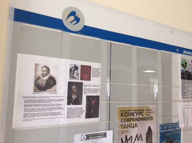 В рамках мероприятий историко-филологического факультета, посвященных Году литературы в России, на отделении «русский язык, литература и журналистика» дан старт проекту «День книги-юбиляра». Студенты группы 13ИПЛ1 (куратор – доцент кафедры «Литература и методика преподавания литературы» А.А.Тимакова) выбрали известную во всем мире историю, сочиненную испанским писателем Мигелем де Сервантесом Сааведрой: «Хитроумный идальго Дон Кихот Ламанческий». Ребята с интересом, кто в первый раз, а кто проверяя свои юношеские впечатления о романе, отобрали интересный материал о книге, яркие цитаты, кадры киноистории о Рыцаре Печального образа и оформили два стенда в 11 корпусе – на 1 и 3 этажах. С увлечением и свойственным группе творческим азартом студенты поработали над видеороликом, соединив элементы интервью, кадры из фильма и неизменную для литераторов любовь к поэтическому слову (Д.Мережковский "Дон Кихот").