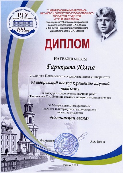 21–22 мая 2015 года в Рязанском государственном университете имени С.А. Есенина состоялся XI Межрегиональный фестиваль научного и литературно-художественного творчества студентов «Есенинская весна», посвящённый 120-летию со дня рождения С.А. Есенина и 100-летию Рязанского государственного университета имени С.А. Есенина, в котором приняла участие студентка 2 курса историко-филологического факультета Пензенского государственного университета (направление «Русский язык, литература и журналистика») Юлия Гарькаева. В конкурсе студенческих научных работ «Творчество С.А. Есенина глазами молодых исследователей» она одержала победу в номинации «За творческий подход в решении научной проблемы». Студентка выступала с докладом на тему «Образ Сергея Есенина в "Романе без вранья" А. Мариенгофа и в книге В. Катаева "Алмазный мой венец"». Её научным руководителем был доцент кафедры «Литература и методика преподавания литературы» Валерий Алексеевич Сухов.