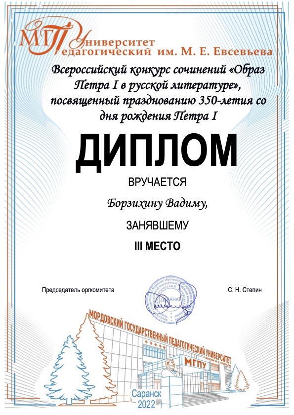 В ноябре-декабре 2022 года на базе кафедры литературы и методики обучения литературе филологического факультета ФГБОУ ВО «Мордовский государственный педагогический институт им. М. Е. Евсевьева»состоялсяВсероссийскийконкурс сочинений «Образ Петра Iв русской литературе», посвященныйпразднованию 350-летиясо дня рождения Петра I. Конкурс был организован в целях развития литературно-художественных способностей студентов и школьников, духовно-нравственного и патриотического воспитания молодого поколения.