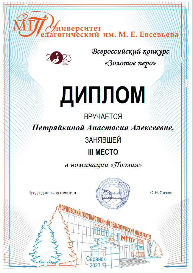 Студентка историко-филологического факультета Педагогического института им. В. Г. Белинского Анастасия Петряйкина вошла в число победителей Всероссийского конкурса «Золотое перо», посвященного Году педагога и наставника. Организатор конкурса – ФГБОУ ВО «Мордовский государственный педагогический университет имени М.Е. Евсевьева».
