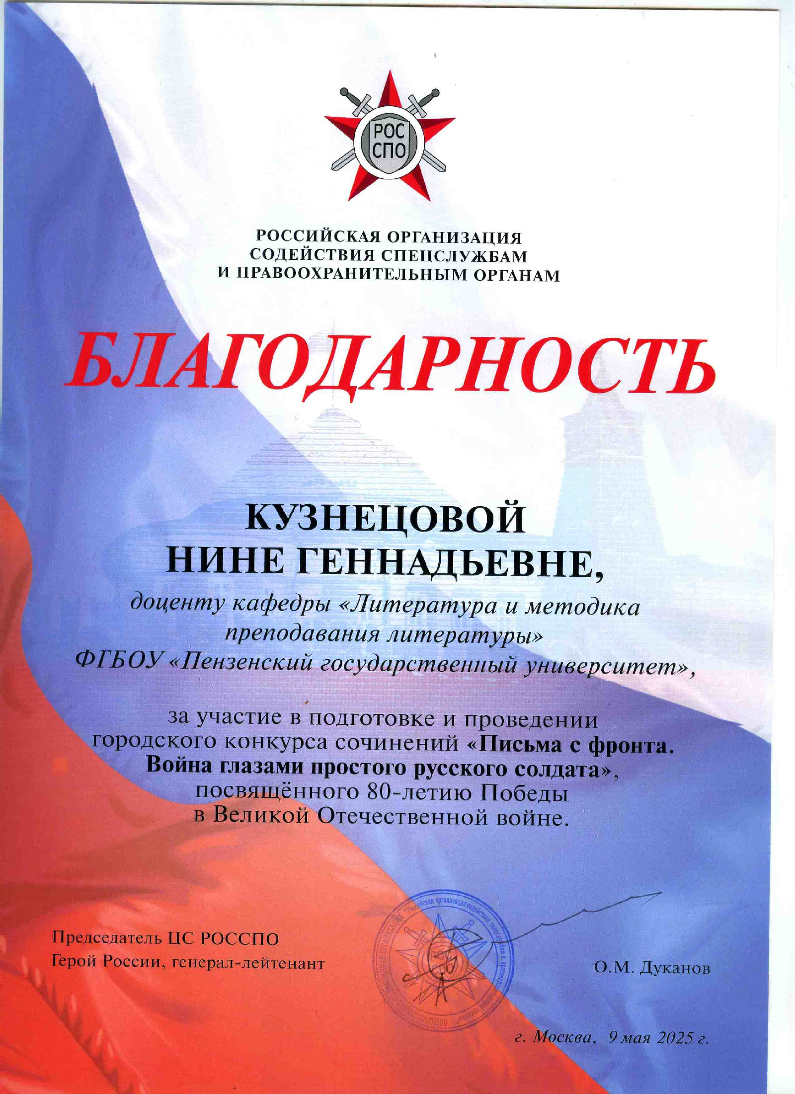 Доценту кафедры "Литература и методика преподавания литературы" Кузнецовой Нине Геннадьевне объявлена Благодарность Общероссийской общественной организации "Российская организация содействия спецслужбам и правоохранительным органам" «за участие в подготовке и проведении городского конкурса сочинений "Письма с фронта. Война глазами простого русского солдата"». Коллектив кафедры поздравляет Нину Геннадьевну и желает дальнейших успехов!