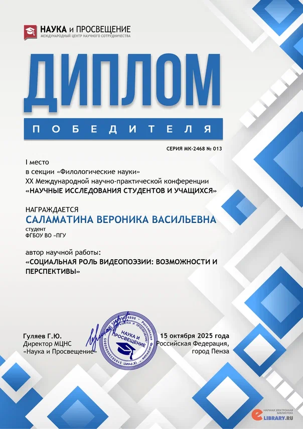 » Новости » Студентка гр. 24ИПД1 Вероника Саламатина стала победителем конкурса научно-исследовательских работ в секции "Филологические науки"