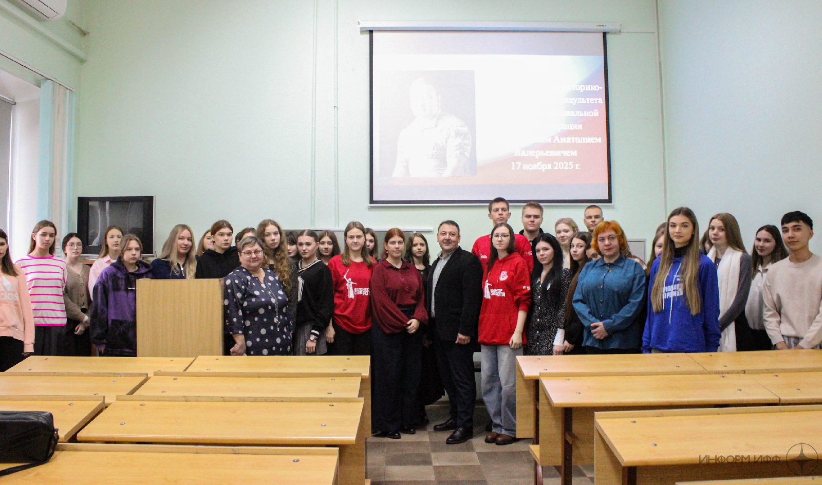 В преддверии празднования Дня Героев Отечества 17 ноября 2025 года в рамках программы патриотического воспитания состоялась встреча студентов групп 25ИПД1,2, 24ИПД1,2, 23ИПИ1 и их кураторов с участником специальной военной операции Анатолием Валерьевичем Безобразовым, ушедшим на фронт добровольцем в 2023 году. Ветеран боевых действий рассказал о своей мотивации ухода на фронт, реакции на этот поступок со стороны жены, детей, родителей, друзей. Встреча прошла в формате диалога. Отвечая на вопросы студентов, военнослужащий рассказал о солдатском быте, боевых буднях, о том, что помогало ему не падать духом, самых запоминающихся эпизодах. На конкретном примере студенты убедились: настоящие герои живут рядом, они являются опорой нашего государства в это непростое для страны время.